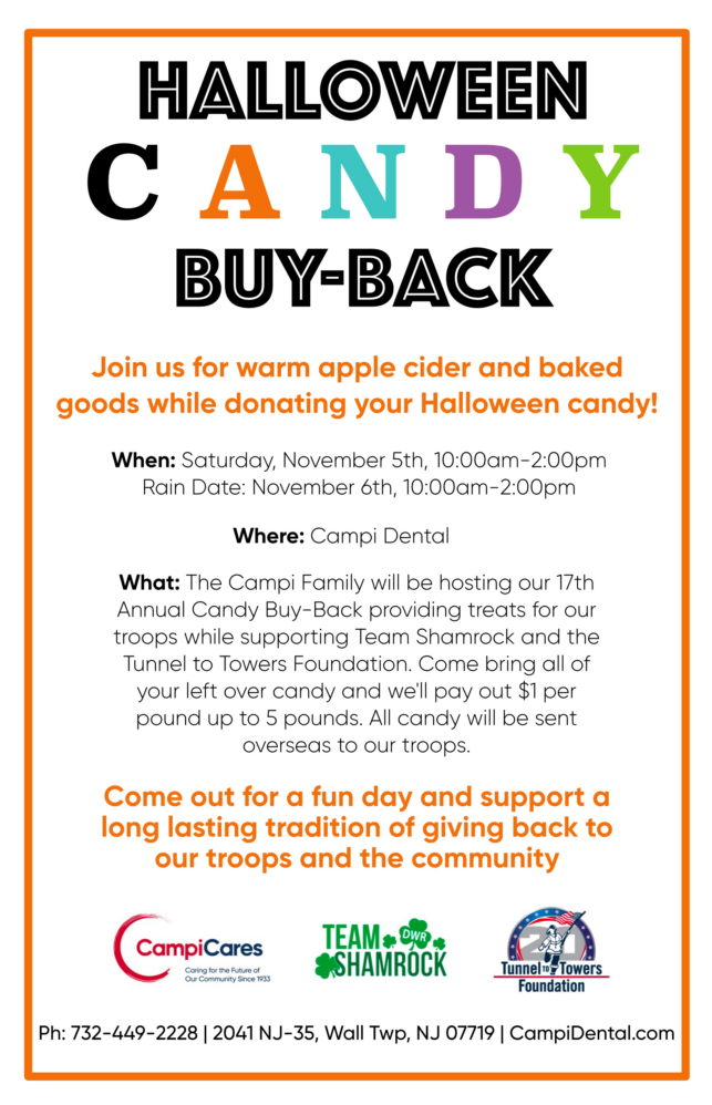 Event Details: At Campi Dental, we will be hosting our 17th Annual Candy Buy-Back where we collect candy from the local community and ship it overseas to the troops as a well deserved treat. We love to get the kids involved, by donating their candy they are eating less sugar while also feeling like they are contributing to a good cause. Campi Dental has worked with Kathy Cunningham and Team Shamrock raising money for the Tunnel to Towers Foundation for many years. Last year we collected over 825 pounds of candy and donated over $1,400 dollars to the Tunnel to Towers Foundation. We hope to beat that amount of candy and the monetary donation this year. Please come out on Saturday, November 5, 2022 for a fun and rewarding day. We will be collecting candy from 10 am-2 pm at our office – 2041 NJ-35, Wall Twp, NJ 07719.