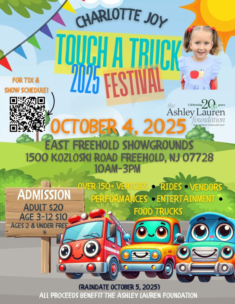 On Saturday, October 4, 2025 (rain date October 5) from 10:00 am to 3:00 pm at the East Freehold Showgrounds, 1500 Kozloski Road, Freehold, The Ashley Lauren Foundation will hold its 4th ANNUAL CHARLOTTE JOY TOUCH-A-TRUCK FESTIVAL Fundraiser. Admission is $20.00 for adults, $10.00 for children up to age 12 and free for children 2 and under.