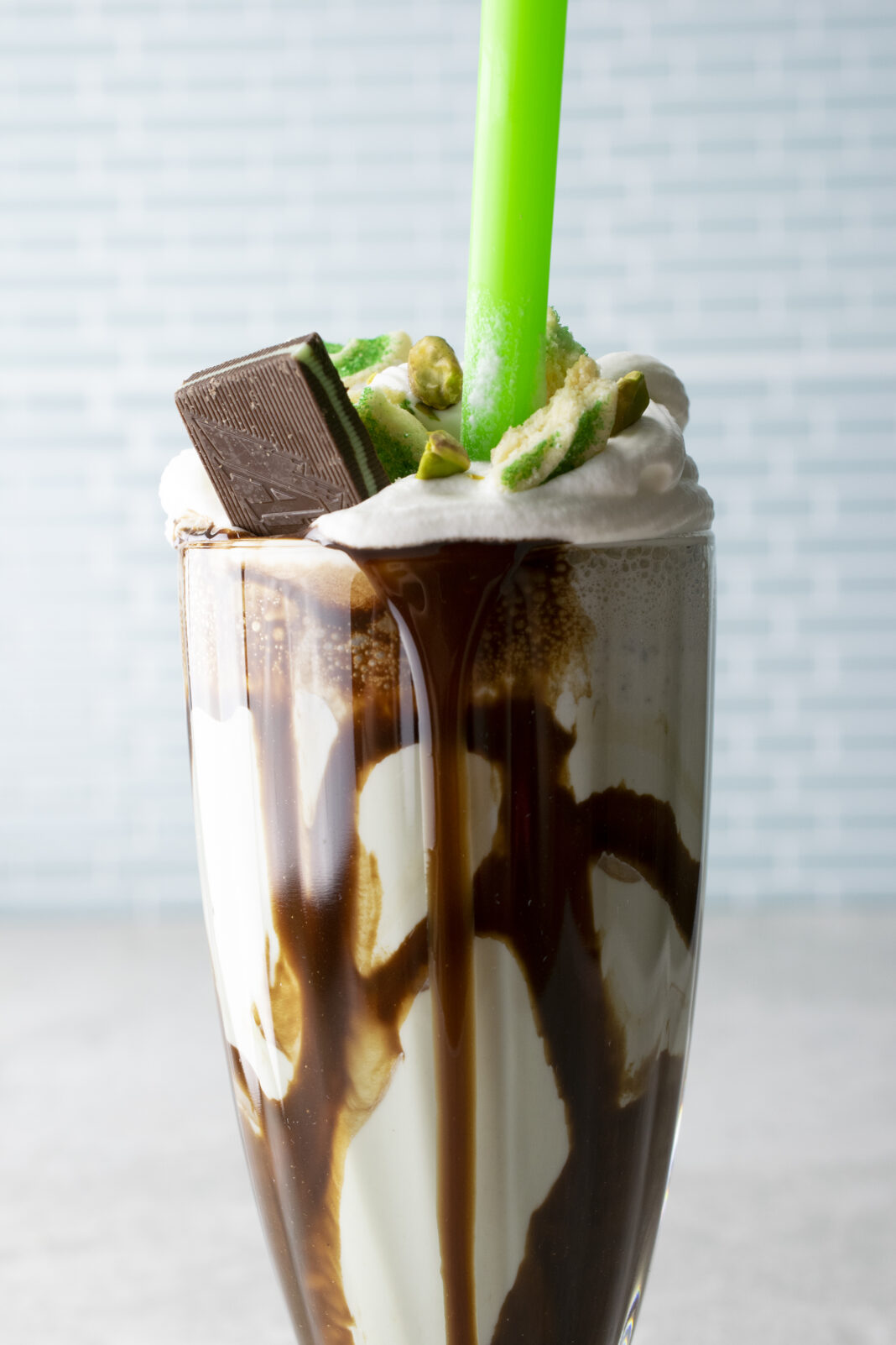 Drizzle chocolate syrup inside the soda glass. Pour ice cream mixture into the glass. Top with whipped cream and garnish with cookies, pistachios and mint chocolate candy, if desired.