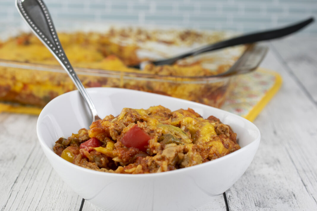 It’s made with hearty ground turkey breast, delicious bell peppers, crushed tomatoes and brown rice then topped with gooey sharp cheddar cheese. This short ingredient list makes it easy to assemble. Brown the turkey and onions then combine all the ingredients, in a layered fashion, in a baking dish. It’s simple to prepare before baking to perfection.