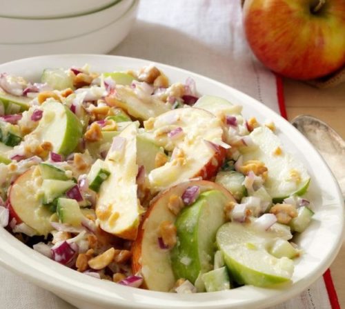 I was looking for something different to make on “Meatfree Monday”. This recipe for Apple Salad caught my eye because you can really take advantage of the upcoming fall apple season. According to the recipe creator: