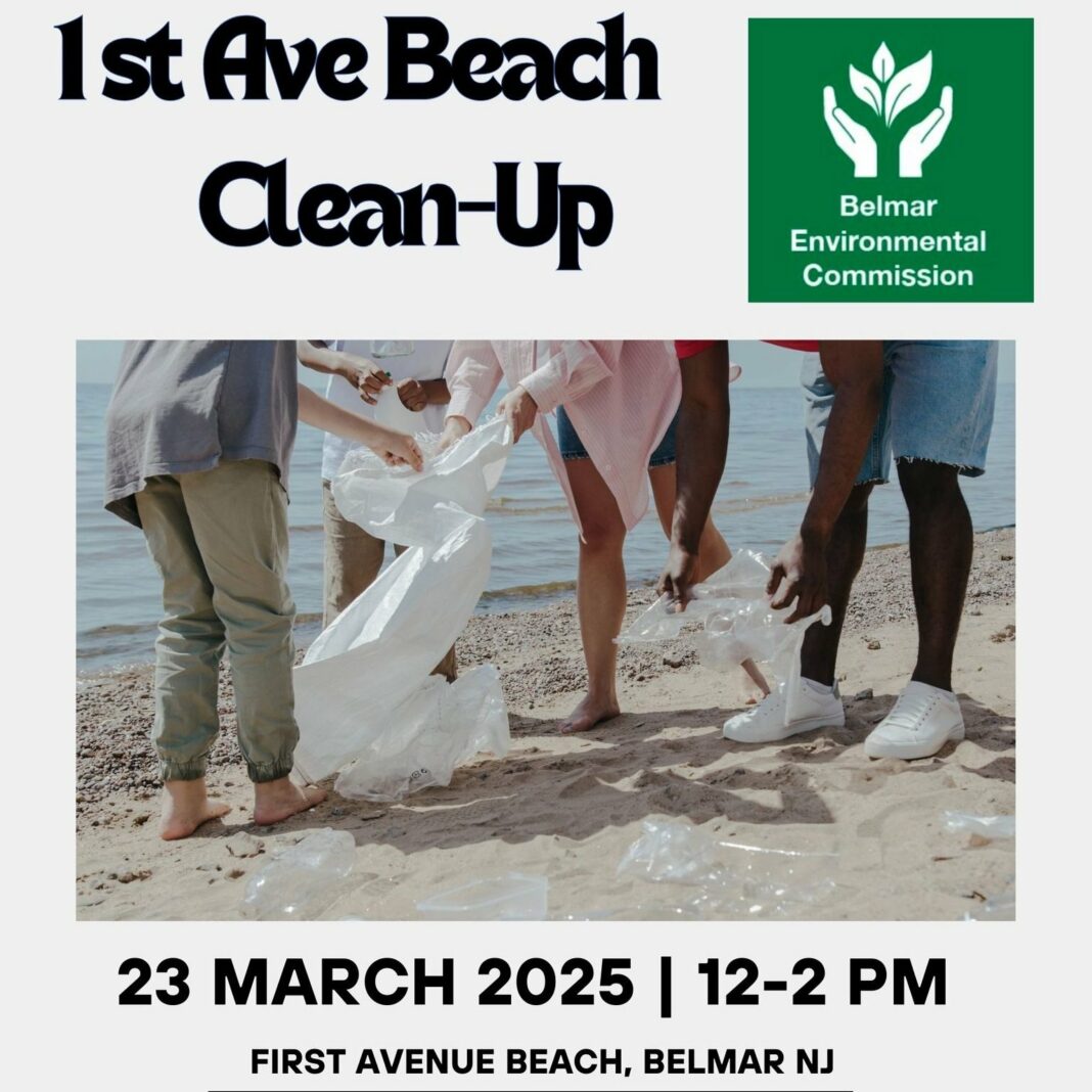 The Belmar Environmental Commission in partnership with the Belmar DPW is hosting a beach cleanup at the First Avenue “Natural Beach” in Belmar on March 23rd, 12- 2 pm.