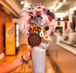 The famous waffle cone isn’t the only thing sold at Coney Waffle. There are also giant soda floats and two-foot-tall Sideshow Shakes, whose name harkens back to its Coney Island roots. There are more traditional waffle cones as well, but those too look a little different because they are all decked out in unique designs.
