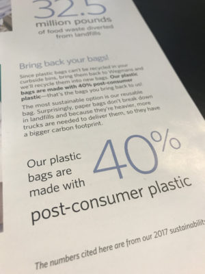 Now, about those plastic bags. Wegmans was an early adopter of reusable shopping bags. But, there’s always the “one time” you go shopping and forget your bags. Wegmans has an answer for that, too! They’ve long had plastic bag recycling bins located by the front doors, making it easy for you to recycle them properly. But they go one step further to let you know they are made of 40% recycled materials. Not great. But, it might alleviate some of the guilt. With all the plastic bag bans going into effect, and deservedly so, I would suspect that they will be moving to a compostable single use bag in the future. Wegmans, are you listening?