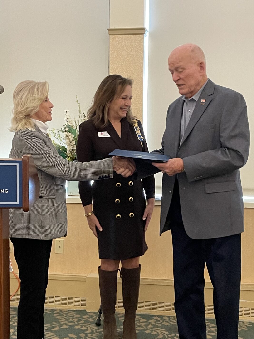 A short video was shown on the role of DAR patriotism over the course of US wars. Also in attendance were chapter members Liz Dunnell, chapter director; Kathleen Mazzacco, vice regent; Anita Nixon, Seabrook resident and DAR chapter member, who serves as the liaison between the chapter and the veterans group and facilitated the DAR attendance at Seabrooks veterans group meeting; and Elaine Everett, Seabrook resident and DAR chapter member.