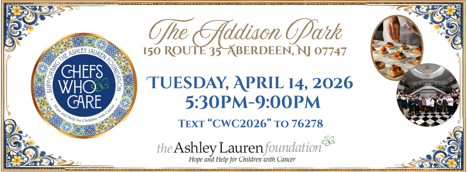 The Ashley Lauren Foundation is proud to announce its highly anticipated 4th Annual Chefs Who Care event, set to take place on Tuesday, April 14th, 2026, at the Addison Park in Aberdeen, NJ, from 5:30 pm to 9:00 pm. Guests will enjoy this exclusive evening of curated tastings with over 40 top NYC, NJ and New England area chefs, premium wines and cocktails, entertainment and a spectacular live auction by celebrated auctioneer Patrick Tully.