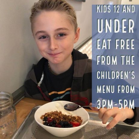 Delicious Three Berry Parfait, Peanut Butter and Banana wrap with Jam on the side, Mac and Cheese and Chimmichurri Flatbread! The best part? All kids 12 and under eat free from the kids menu 3pm to 5pm with the purchase of full price menu item!