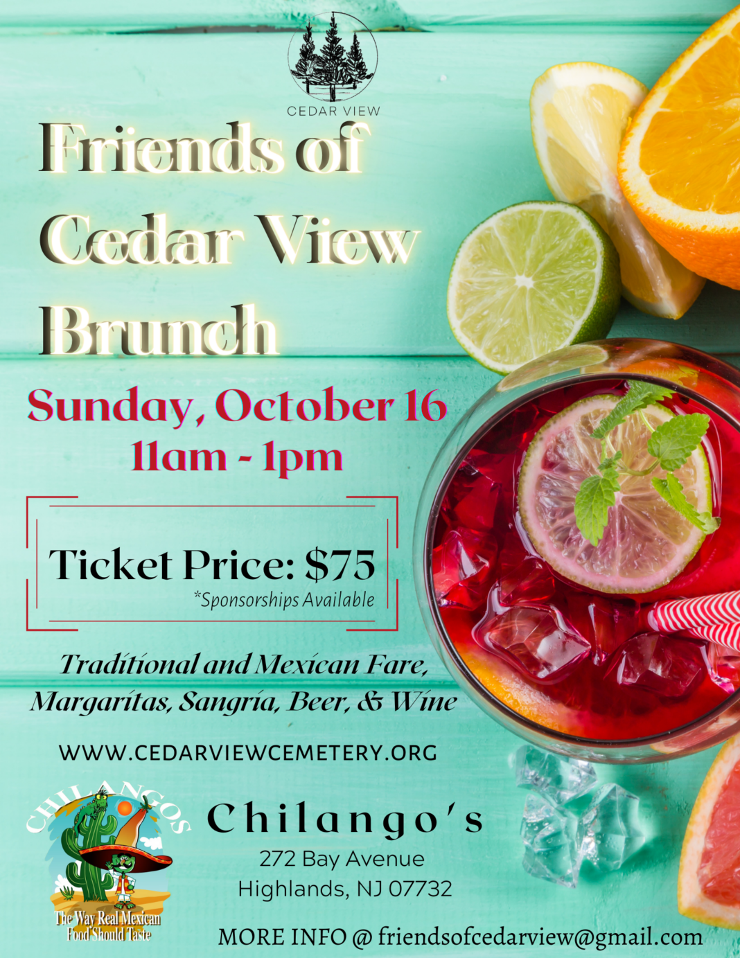 On Sunday, October 16th, 2022 from 11 am to 1 pm, the Friends of Cedar View will hold a Fundraiser Brunch for the continued restoration and care of Historic Cedar View Cemetery in Lincroft, NJ. The event will be held at Chilangos Mexican Restaurant, 272 Bay Ave. Highlands, NJ.