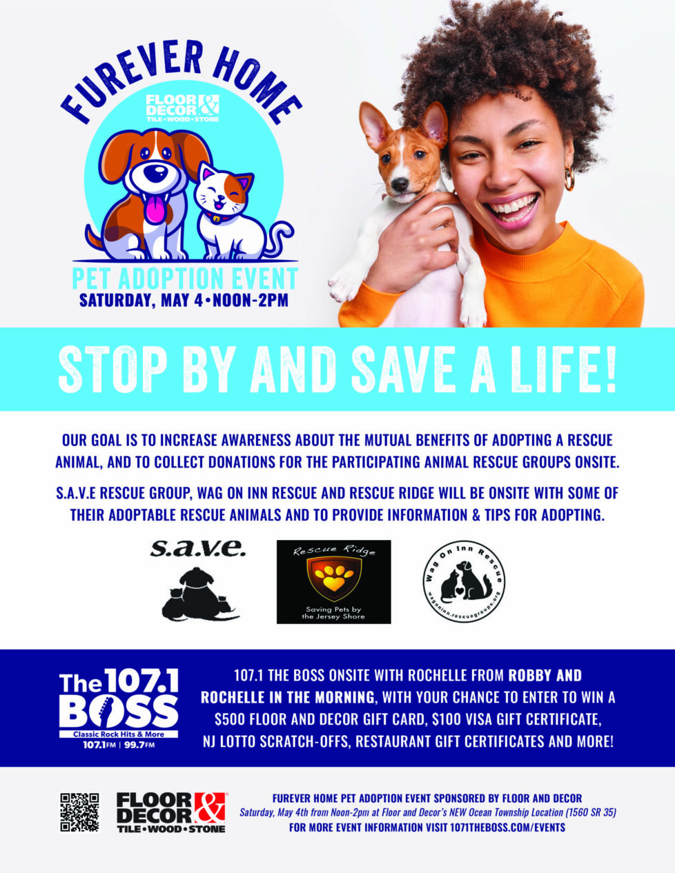 WWZY 107.1 The Boss and Floor & Decor are hosting Furever Home, a pet adoption event taking place on Saturday, May 4 th from 12 Noon to 2pm at Floor & Decor’s new Ocean Township location.