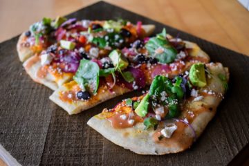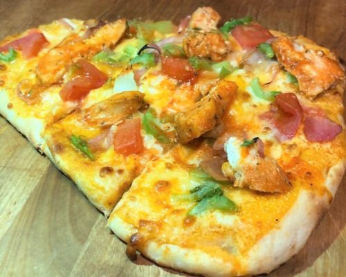 Buffalo Chicken, tomatoes, mozzarella and cheddar cheeses, celery, pickled onion, and cilantro. Pulled Pork, tangy BBQ sauce, blended cheese, garlic, scallion, roasted onion and tomato. Super delicious!