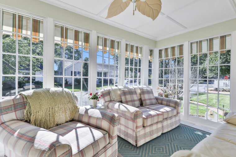 Main home has a sun-kissed Sunroom, Living Room with gas fireplace, Den, spacious Kitchen, Dining Area, 3 bedrooms, and 3 baths.