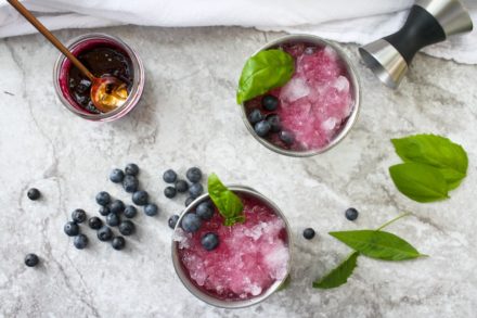 Pour into tall glass, garnish with basil sprig. (Sugar in the jam replaces use of simple syrup)