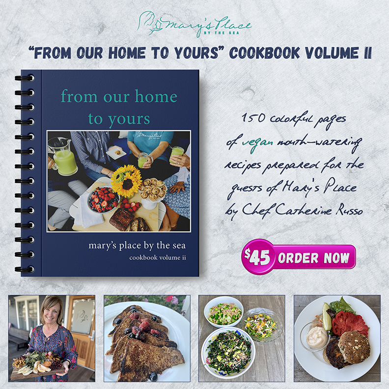 During the respite home’s formative years, guests enjoyed veggie and hummus wraps made by volunteers. It wasn’t until the non-profit moved into its current custom-built, 10-bedroom, bed-and-breakfast-style home with a large teaching kitchen that an in-home chef was added into the equation. Chef Catherine Russo has lovingly taken the hospitality of Mary’s Place by the Sea to the next level. As a chef for over thirty years in the culinary world, working in a plant-based kitchen would be a new, exciting challenge for Cathy. She set out to find and create plant-based dishes for the guests of Mary’s Place, which would not only nourish them physically but emotionally as well. Over the last six years, her dishes have filled Mary’s Place by the Sea with all of the sensations of home.