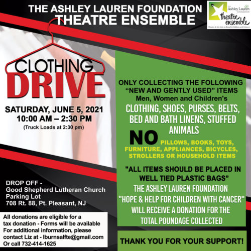 The Ashley Lauren Foundation Theatre Ensemble Annual Clothing Drive to benefit The Ashley Lauren Foundation (ALF) will be held on Saturday, June 5, 2021, from 10:00 am to 2:30 pm (Truck Loads at 2:30 pm). The drop-off, will be located at Good Shepherd Lutheran Church Parking Lot, located at 708 Rt. 88 in Point Pleasant, NJ. This event will assist the Foundation in its mission to provide Hope and Help for NJ Children with Cancer. Community support of this event will enable the Foundation to help hundreds of children who are battling cancer with the assistance they and their families desperately need.