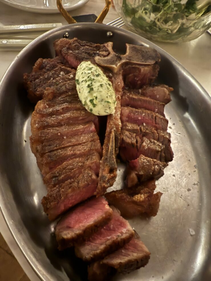 The Florentine steak is out of this world, it is so tender it melts in your mouth. It’s exactly what you want when you hear the word “Florentine steak”, sliced up and ready to devour. We added the arugula and chicory salad with it, and it was the perfect pairing of acidity with an excellent quality steak. I also loved the Branzino. I thought it had such a great flavor and was perfectly cooked. They put a crust of olive tapenade on the fish and it added a lot of zing to the dish.
