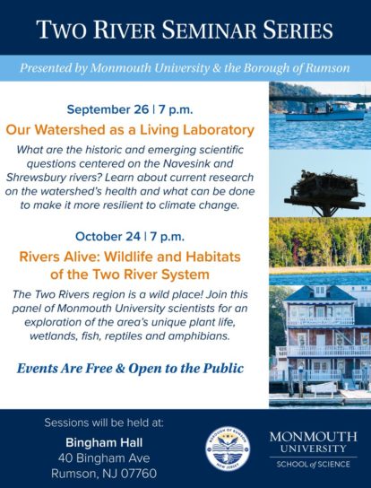 The Monmouth University School of Science and the Borough of Rumson will host a Two River Seminar Series centered on the environment and wildlife of the Navesink and Shrewsbury rivers beginning in September. Members of the public of all ages are invited to participate in these educational discussions led by experts from the university’s Marine and Environmental Biology and Policy Program and Urban Coast Institute.