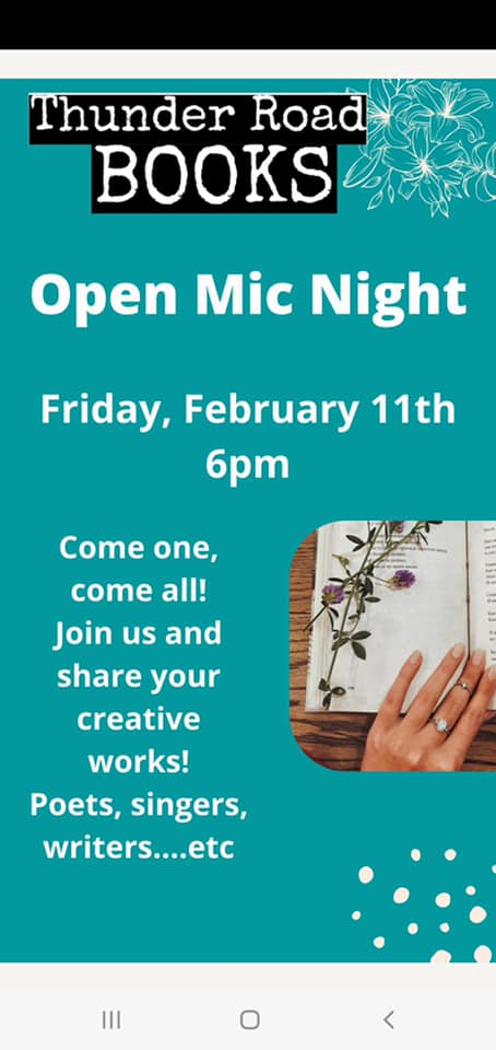 Join us for the opportunity to read your poetry, an excerpt from your book, or sing a song for open mic night this Friday, February 11th at Thunder Road Books in Spring Lake!