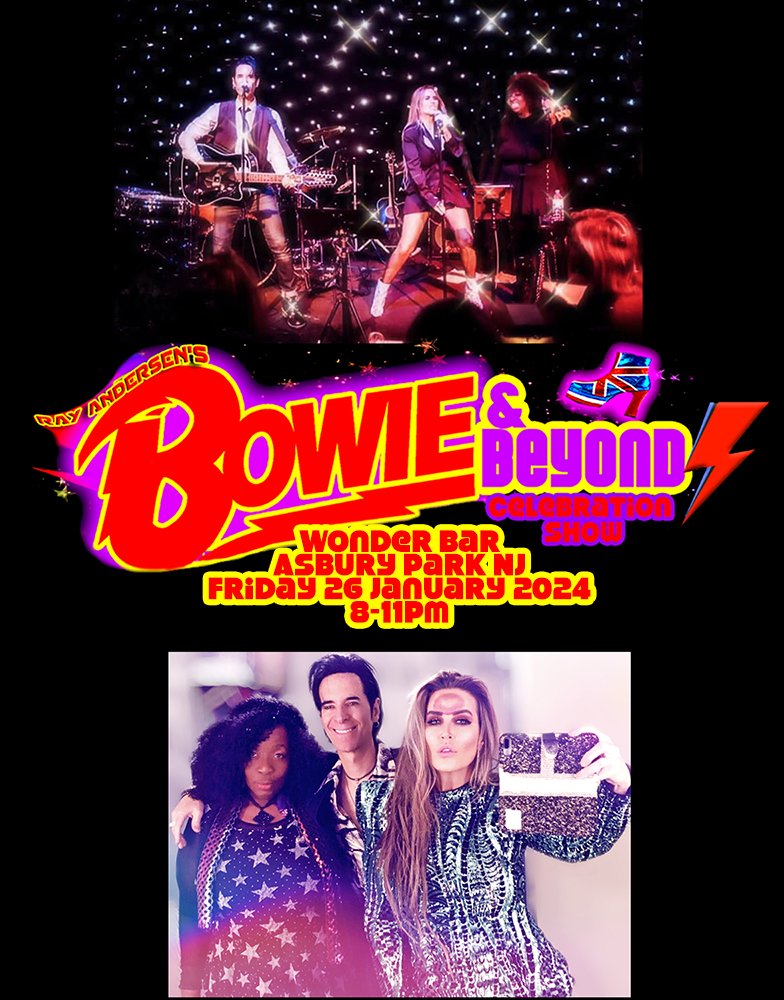 We present a loving, sexy celebration of the master’s music and visual style, as well as songs he co-wrote and/or produced….as well as delicious glam-rock gems like Fox On the Run (Sweet), Bang A Gong (T. Rex), Walk On The Wild Side (Lou Reed), All The Young Dudes (Mott the Hoople) and more.