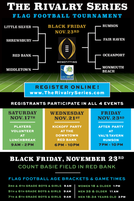Hundreds of families already have registered for The Rivalry Series, an annual single elimination flag football tournament for men, women and children at Count Basie Field in Red Bank on Friday, November 23, 2018 (Black Friday). Â And our goal is to recruit more!