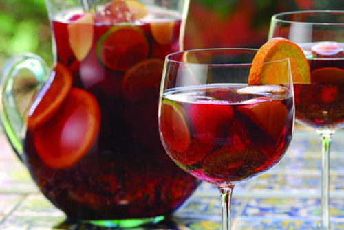 Berry Sangria with raspberries, blackberries, oranges, limes, and cherries over ice