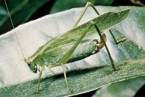 A Katydid can ‘hear’ via flat patches on their legs called a tympanum. Often people mistake a spear-like piece on the end of their abdomen for a stinger. Katydids do not sting. These appear on the larger Katydids, females; the long part is actually their egg depositor or “ovipositor.” Females use this to deposit their eggs into the ground and into the stems of plants.