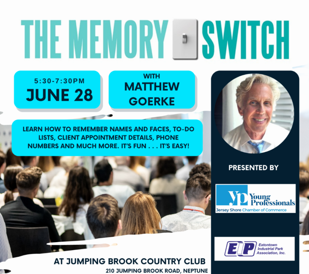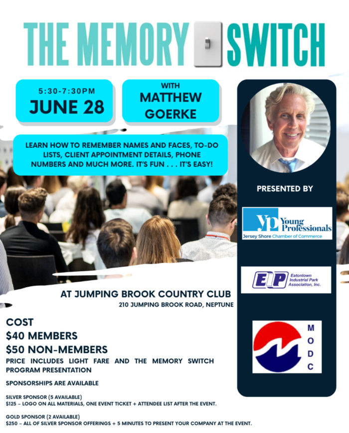 If you want to network and learn how to remember names and faces, don’t miss the Memory Switch this Tuesday with Matthew Goerke. The Jersey Shore Chamber Young Professionals are presenting this educational and fun event, and invite you to enjoy light fare and the presentation at Jumping Brook Country Club in Neptune on Tuesday, June 28 from 5:30 to 7:30p.m. Register online today to grab a seat before it’s too late.