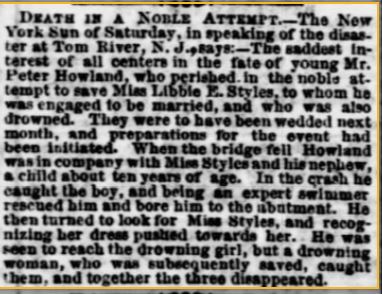 A week before their planned wedding on a Sunday morning 8 September 1870, over 500 men, women and children from the Centenary Church left by train at 6:30 a.m. for a clam bake at Tom’s River, Ocean County, New Jersey. On their arrival at the depot, they began to saunter leisurely across the bridge in groups. Only a few made it over with another 60 on the bridge when it collapsed and over half of these terrified mostly children were thrown into the water. As is usual in such cases, there were striking instances of heroism. Peter Howland who had been on the bridge and was also thrown into the water, saw his 11-year-old nephew struggling to stay alive. Peter swam to him and upon reaching shore with him, turned and saw his Libbie struggling.