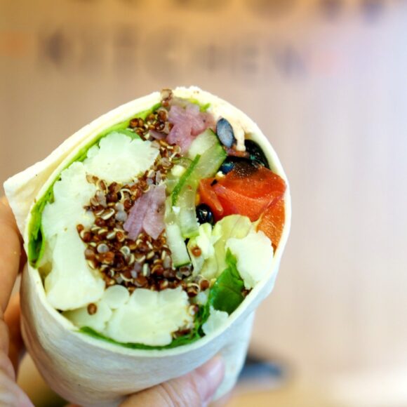 East meets West in this savory wrap; sweet potato mash, broccoli, bean sprouts, carrots, jicama with herb & mint barley.