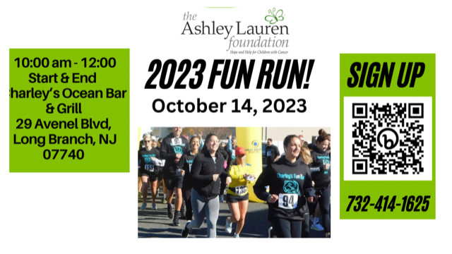 This event is sponsored by Charley’s Ocean Bar & Grill in Long Branch, NJ. Starting and ending point is at Charley’s, 29 Avenel Blvd, Long Branch, NJ 07740. The run will begin at 10:00am and will be followed by more post run fun with a Happy Hour at Charley’s for all runners! Each participant will receive a free dry fit t-shirt. Help children with cancer in New Jersey by signing up as a runner or becoming an event sponsor.
