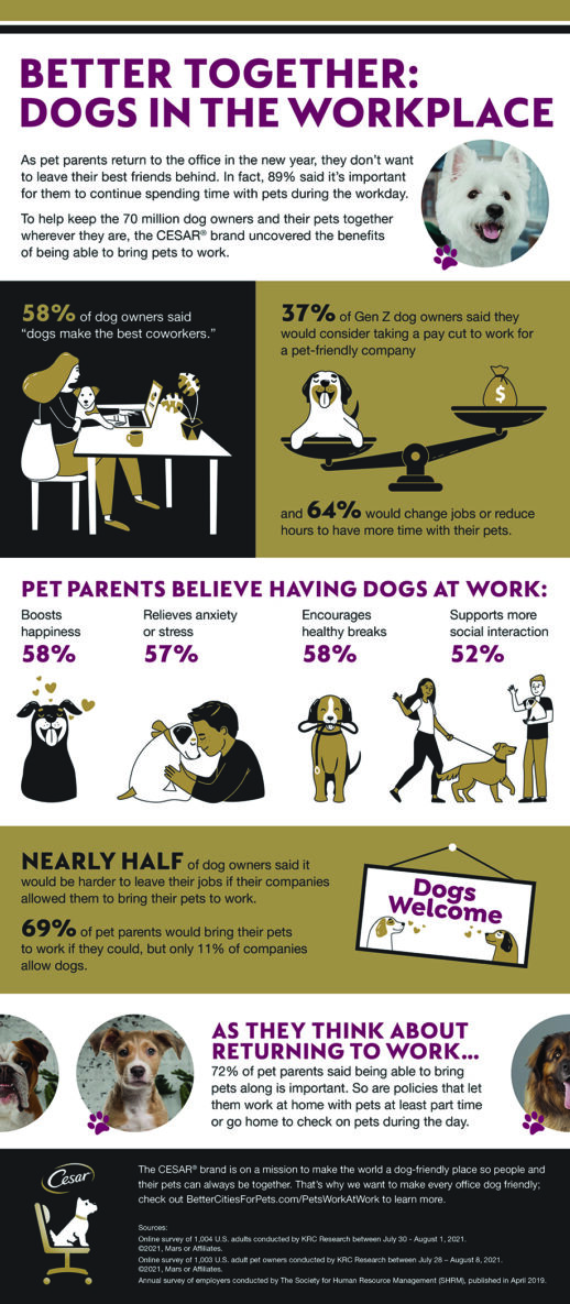 After many pet parents have returned to the office in the new year, they began looking for ways to continue spending time with their furry friends during the workday. In fact, 72% of pet owners said being able to bring pets to work is important, according to an online survey conducted on behalf of the CESAR brand.