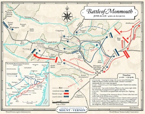 While the battle began badly for the Patriots, soon “the infantry battle gave way to a two-hour artillery duel, during which Clinton began to disengage. The duel ended when a Continental brigade established artillery on a hill overlooking the British lines, forcing Clinton to withdraw his guns. Washington launched two small-unit attacks on Clinton’s infantry as they withdrew, inflicting heavy casualties on the British during the second. An attempt by Washington to probe the British flanks was halted by sunset, and the two armies settled down within one mile (two kilometers) of each other. The British slipped away unnoticed during the night to link up with the baggage train. The rest of the march to Sandy Hook was completed without further incident, and Clinton’s army was ferried to New York.” (Wikipedia)