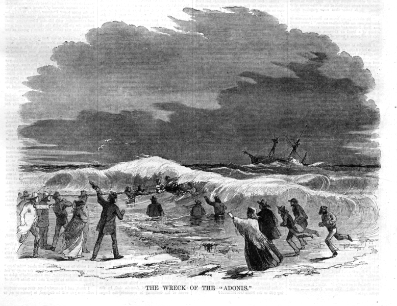 It was March 8, 1859. The 550-ton wooden bark, Adonis was on her way from England to New York Harbor with a cargo of 124 grindstones, 600 lead ingots, 39 casks of ground flint, 100 casks of alkali, 501 casks of soda, 170 casks of powder, 130 casks of carb soda, 200 casks V. red, and 500 kegs C. soda.