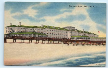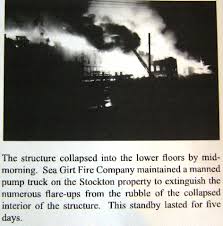 This was a horrendous fire with a relentless wind whipping off the ocean fanning the blaze in this colossal building. The ‘Stockton’ fire brought 43 fire companies and first aid from Monmouth and Ocean counties. Crowds of onlookers and numerous boats full of onlookers sat oceanside to watch as the flames took hold. Luck would have it that with a wind shift blowing out to sea along with watering down, nearby homes were spared. The end of an era!