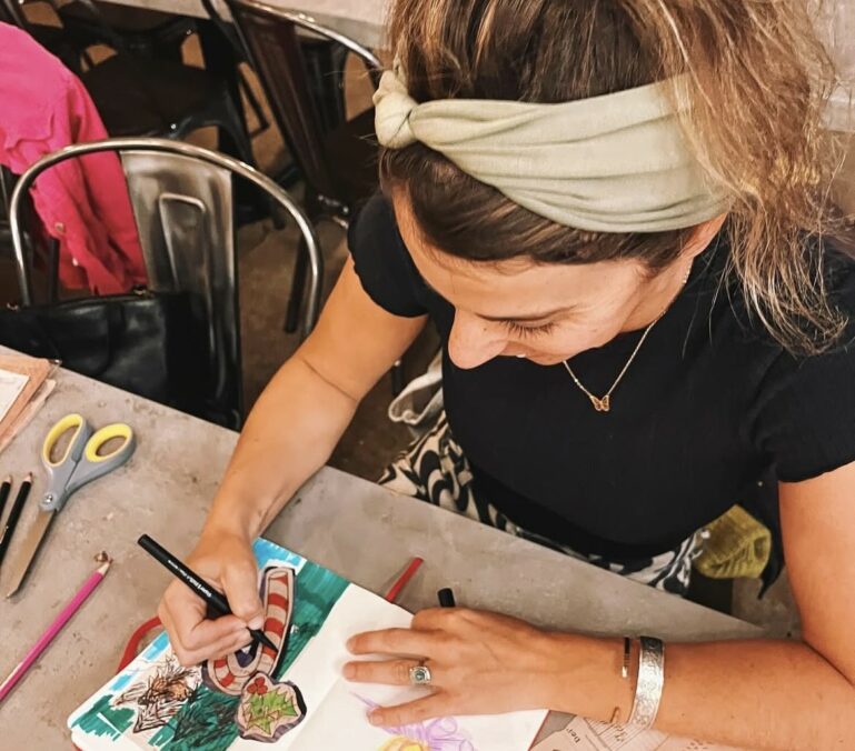 As a graduate of FIT in Manhattan, Kate pursued a career in advertising / graphic design and soon decided that she’d like to do her own designing outside of work. Her workshops entail drawing and coloring your own images, where each one has a different theme. The one I went to involved a November theme where you draw autumn-related pictures.
