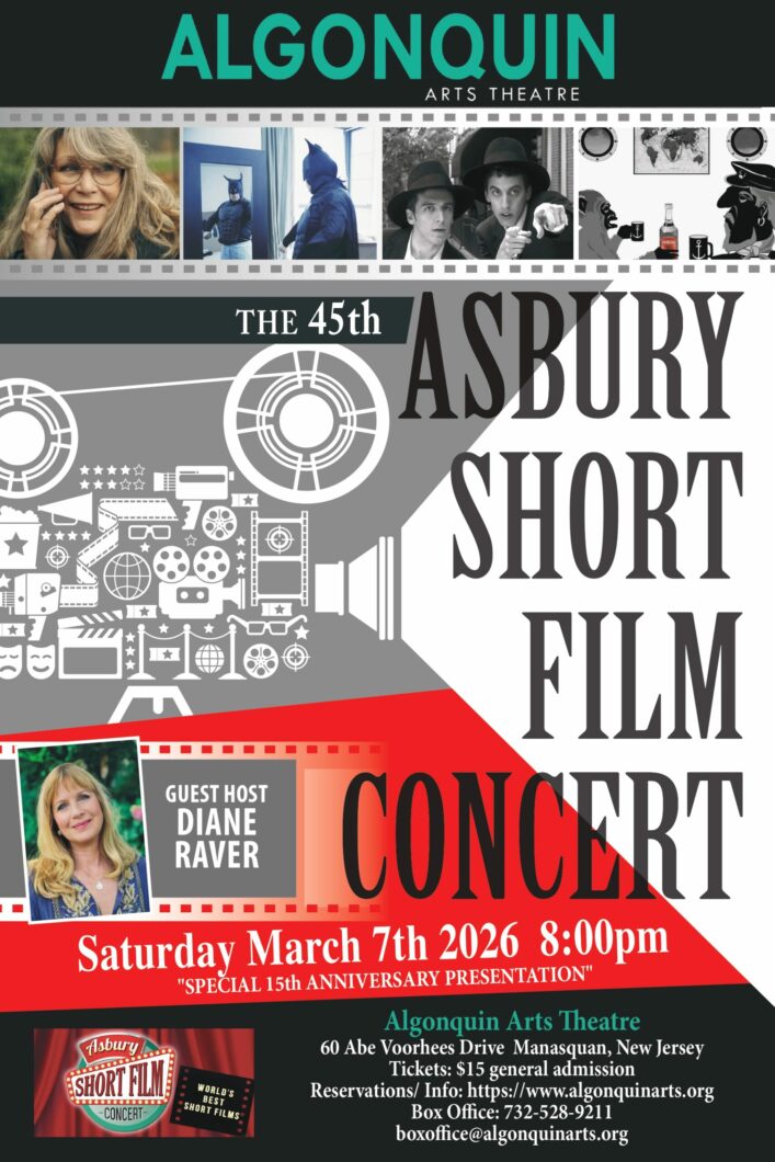 The 45th Asbury Short Film Concert reels into Manasquan, N.J on March 7, 2026. Asbury Shorts International, New York City’s longest-running non-competitive short film showcase, returns to the revered Algonquin Arts Theatre in Manasquan, New Jersey on Saturday, March 7, 2026, to present their national touring “45th Short Film Concert- An Evening of the World’s Best Short Films.” The first film blasts onto the screen at 8:00 pm. This will be Asbury Shorts International’s 15th anniversary yea,r bringing world-renowned short films to Algonquin Arts. Diane Raver, Founder of The Garden State Film Festival, will once again serve as guest host. The short film concert is recommended for ages 16 and older.