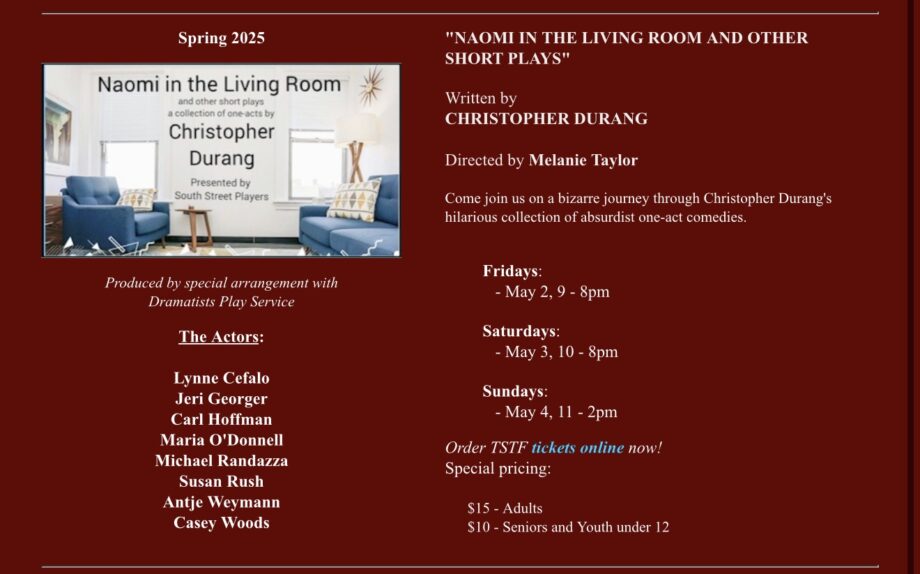Melanie began directing with SSP two years ago when she directed her first full-length show, “The Dining Room” at Wesley Hall. She’s at Wesley Hall again this May, directing a show of select short plays from the controversial playwright Christopher Durang, starting May 2nd and lasting through to Mother’s Day.