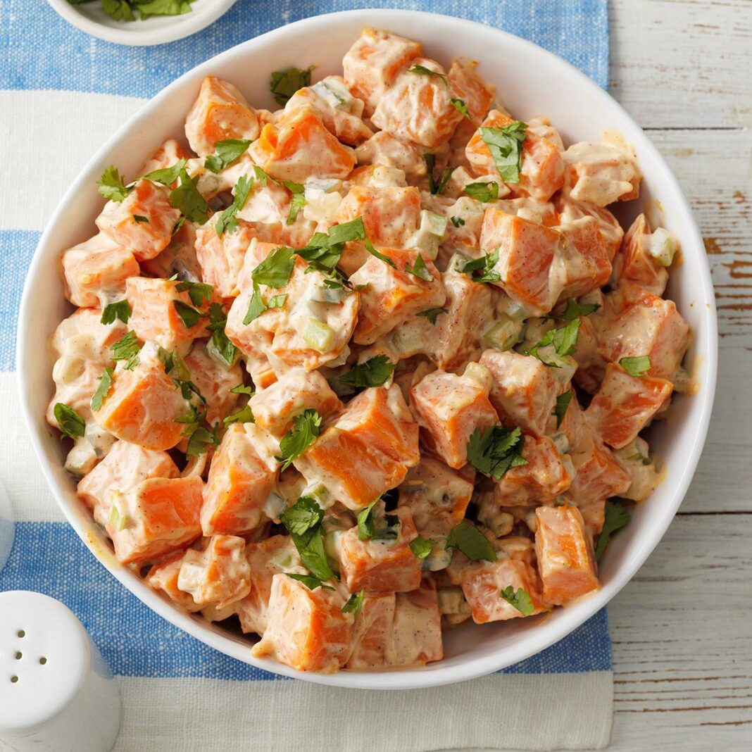 - Bring a large pot of salted water to a boil, add chopped sweet potatoes and cook for 3-5 minutes. You want potatoes to be soft enough to fork but not mushy. Drain sweet potatoes and add to a large bowl and stick in the refrigerator to cool.