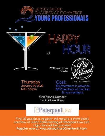Join the Jersey Shore Chamber of Commerce on January 30th, 5:30-7:30 at Pig and Parrot Sandbar for our Young Professionals Happy Hour!