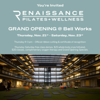 On Thursday, November 21, Renaissance Pilates + Wellness Launches New Fitness Oasis & Wellness Sanctuary at Innovative Bell Works. Nov. 21-23 enjoy FREE class demos, complimentary oxygen therapy, $25 whole body Cryo/Infrared & $20 Classes plus more grand opening specials!